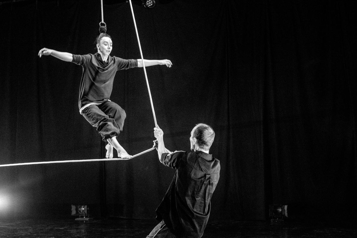 Through deep trust and intricate collaboration, Ana and Vincent create an intimate and tender space where the mechanics of connection are laid bare – sometimes through touch, sometimes through the use of strings, bodies and objects are eternally connected and intertwined. Ropes, carabiners, and splicing needles take center stage as Ana and Vincent reveal the artistry and performative nature of rigging. The work constantly shifts between illusion and revelation, urging us to suspend disbelief before exposing the underlying reality.